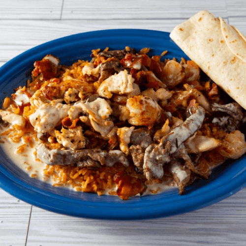 Bacon, grilled chicken, steak, and shrimp over a bed of rice. Topped with cheese dip and served with tortillas