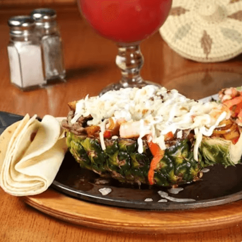 Your choice of meat grilled with red and yellow peppers, onions, tomatoes, and pineapple. Served inside of a hollowed out pineapple