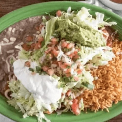 Three Deep-fried tacos filled with ground beef. Topped with pico de gallo & shredded cheese. Served with rice, lettuce, guacamole & tomatoes.