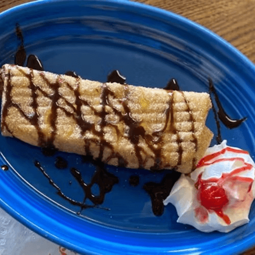 Stuffed with grilled chicken, chorizo, rice, beans, shredded cheese, onions, & chipotle sauce inside. Topped with cheese dip & pineapple slices. (Served deep-fried)