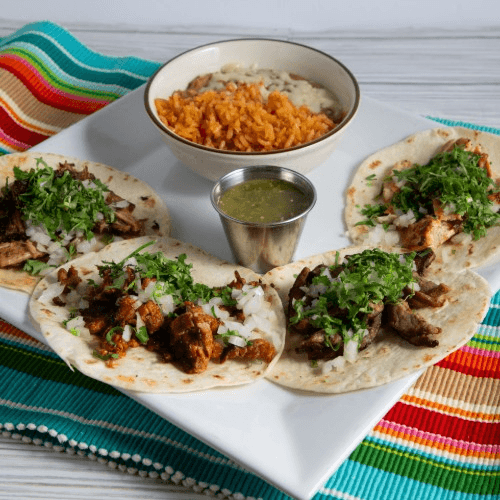 (4) steak, Grilled Chicken, al pastor or carnitas soft shell tacos topped with onions & cilantro. Served with rice & beans