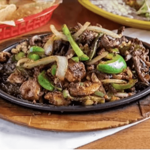 Steak, chicken, chorizo, and shrimp grilled with bell peppers, tomatoes, and onions