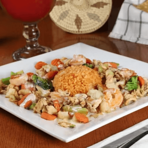 Grilled chicken breast and shrimp topped with mushrooms, onions, tomatoes, bell pepper, and melted cheese. Served with rice, beans, and tortillas