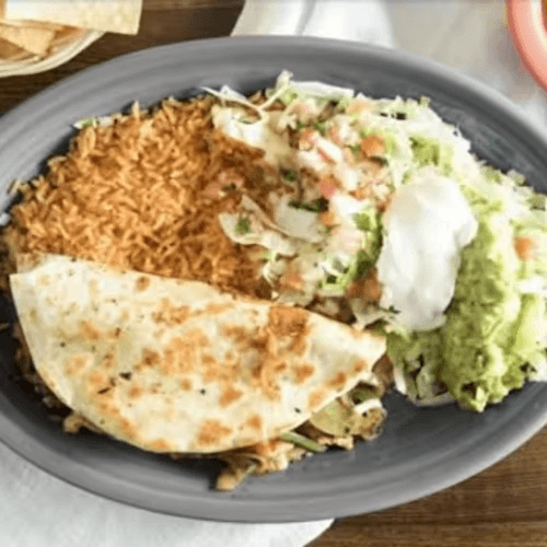Choice of steak or chicken marinated in adobado sauce, sandwiched between two tortillas with beans and cheese. Lettuce, tomato, guacamole, and sour cream on the side