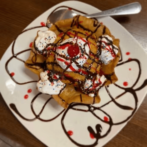 Cinnamon ice cream covered in frosted flakes, slightly deep fried, and topped with chocolate syrup and a bit of whip cream