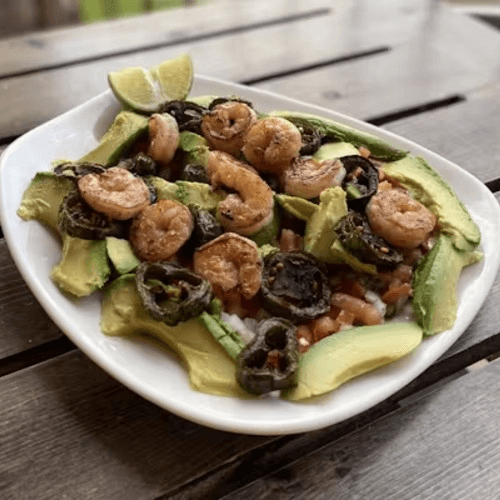 Shrimp, mango, sliced avocado, fried jalapeños, tomatoes, cilantro, & diced red onions