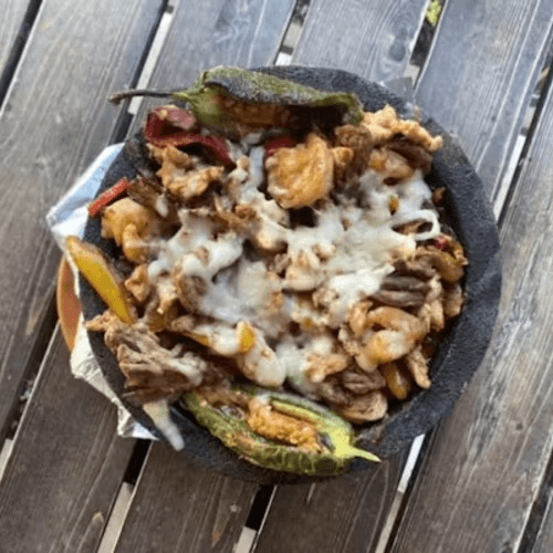Grilled chicken, steak, shrimp, chorizo, sauteed onions, tricolor peppers, and a fried jalapeno. Topped with ranchero sauce and melted cheese. Served with rice, beans & tortillas. (Serves two)