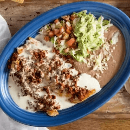A flour tortilla deep fried & stuffed with your choice of filling, & topped with white cheese dip. Served with guacamole salad, sour cream, rice & beans. (Lunch size)