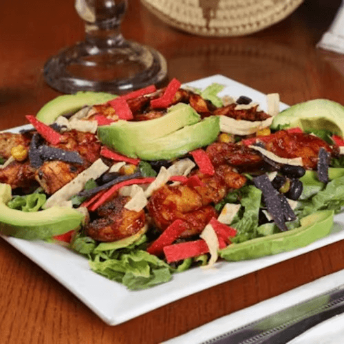 Grilled shrimp and slices of fresh avocado over a bed of lettuce, black beans, corn, and colorful tortilla chips