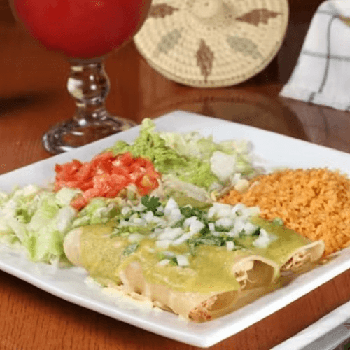 (3) Shredded chicken, cheese, and spinach flour tortilla enchiladas, topped with white cheese dip and cilantro. Served with lettuce, guacamole, tomato, sour cream, and rice