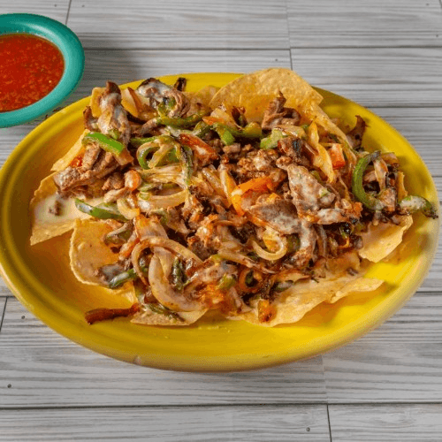 A bed of crispy tortilla chips covered with melted cheese and topped with onion, bell pepper, and your choice of grilled chicken or steak