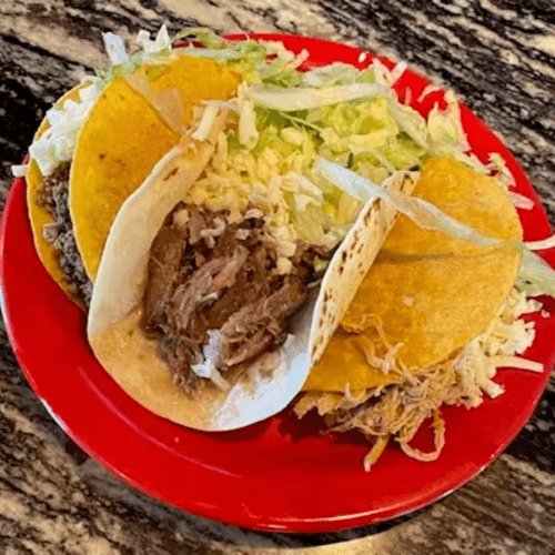 Three hard or soft shell ground beer, shredded chicken or pork tacos. Served with rice & beans
