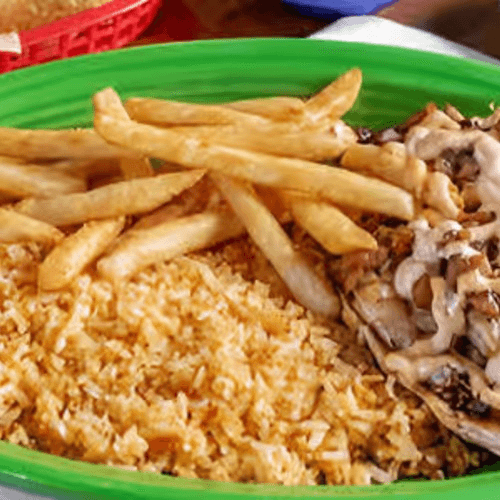 Grilled chicken & shrimp topped with chipotle sauce & pico de gallo. Served with rice, fries, & tortillas
