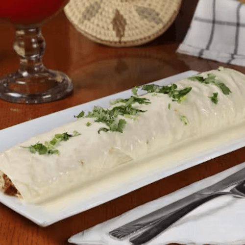A flour tortilla burrito filled with beef tips, beans, & rice inside. Rolled up & topped with white cheese dip & red enchilada sauce. Served with french fries. (Lunch size)