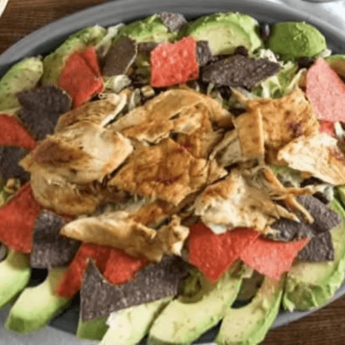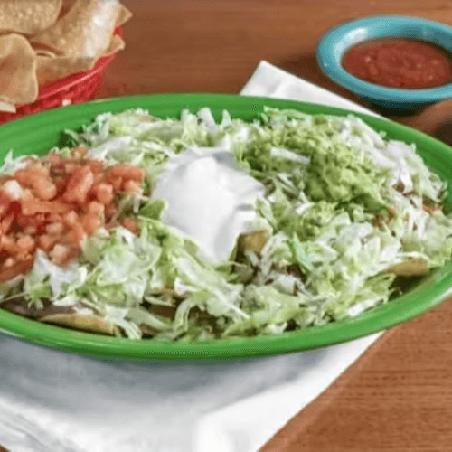 A large crispy flour tortilla bowl topped with lettuce, shredded cheese, sour cream, guacamole, white cheese dip, and your choice of grilled chicken or steak which has been sautéed with onions, bell peppers, and tomatoes