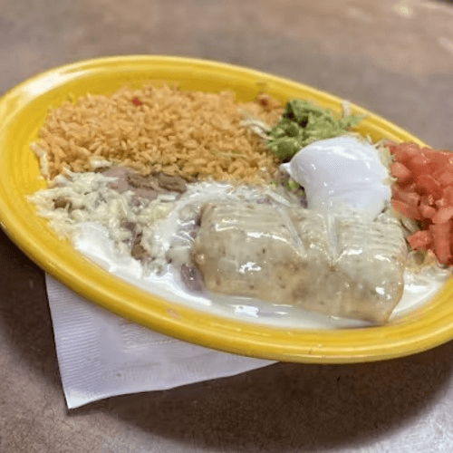 A deep-fried flour tortilla, stuffed with shrimp, and topped off with white cheese sauce and more shrimp. Served with pico, sour cream, guacamole salad, rice, and beans