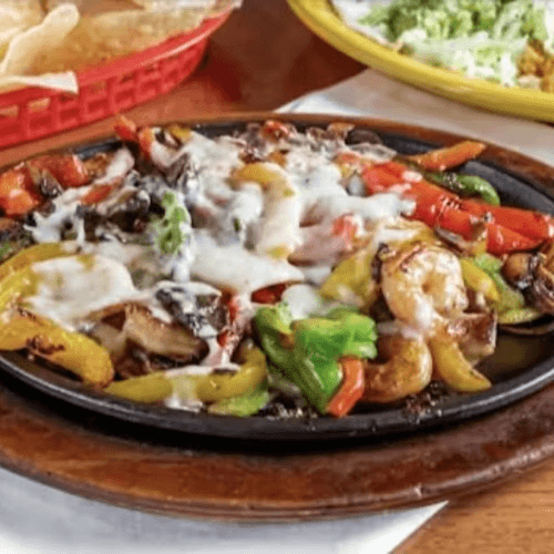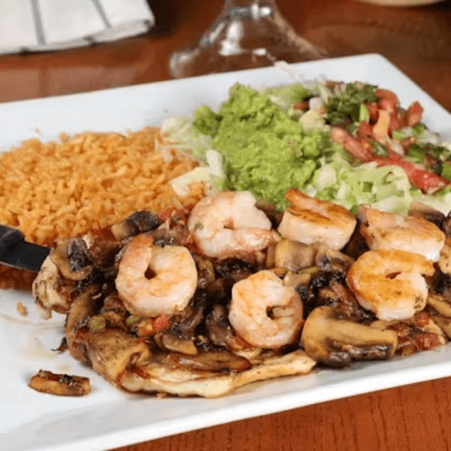 Rib-eye steak topped with grilled shrimp, mushrooms, peppers, and melted cheese. Served with rice, beans, lettuce, guacamole, sour cream, pico de gallo, and a side of tortillas