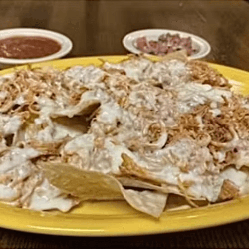 A bed of crispy tortilla chips covered with melted cheese and topped with shredded chicken. (Chicken is already cooked with onion, bell peppers and tomato)